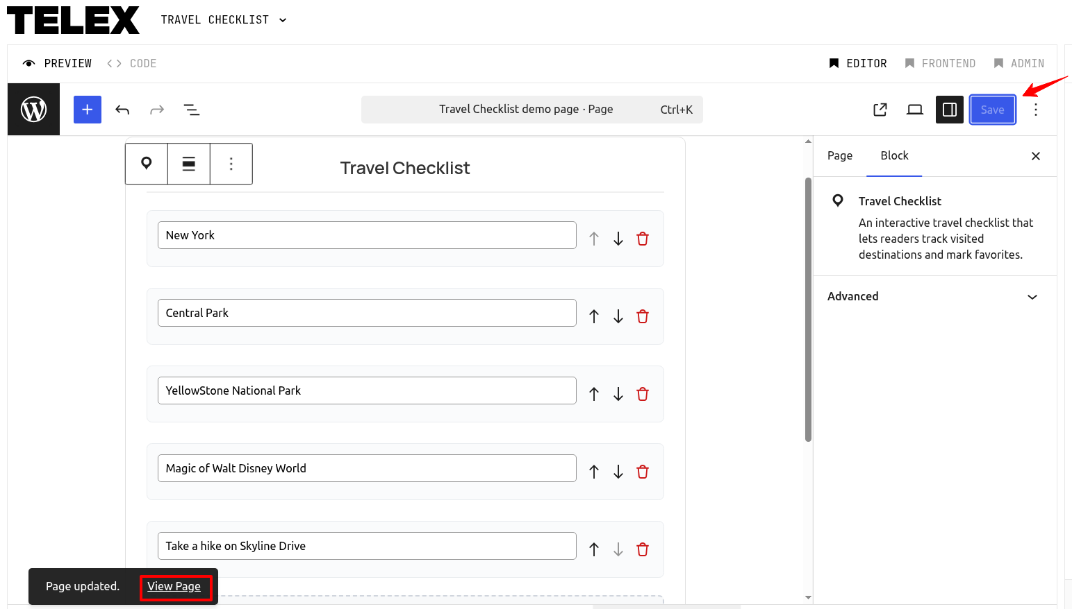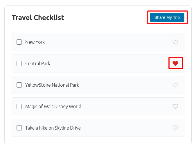 “Please build a Travel Checklist block. It should display a list of destinations that readers can check off as visited. Add a heart icon beside each destination that toggles as a favorite. Include a button labeled ‘Share My Trip’ that copies the checklist (with checked and favorite items) to the clipboard. In the editor, allow me to add, remove, and reorder destinations using simple up and down buttons.”