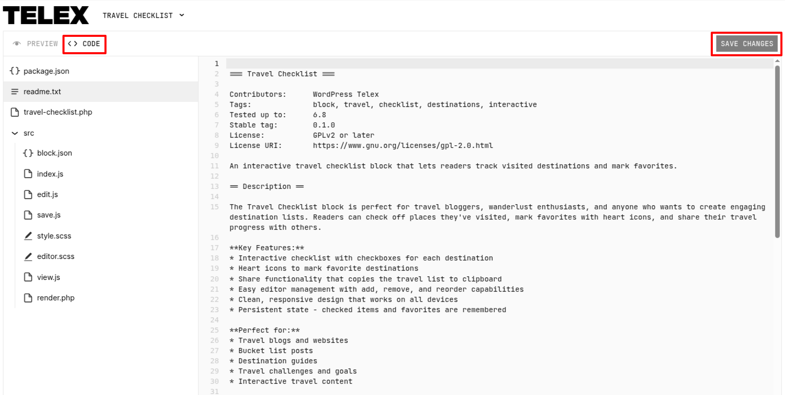 Telex acts as a live code tutor. Users can see how prompts translate into real block code, making it an excellent educational tool for aspiring developers learning React or block development.