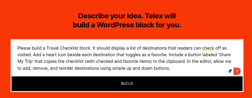 After logging in, simply write your prompt in plain language. For this example, let’s say I’m a travel blogger who wants to share destination guides in a fun and interactive way. I imagine a “Travel Checklist” block where readers can see a list of must-visit spots, check off places they’ve been to, and even mark their favorites. I’d also love a “Share My Trip” button so visitors can copy their checklist and send it to friends.